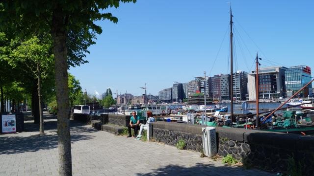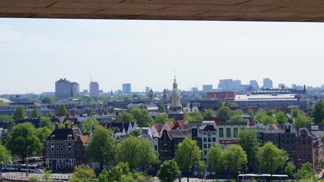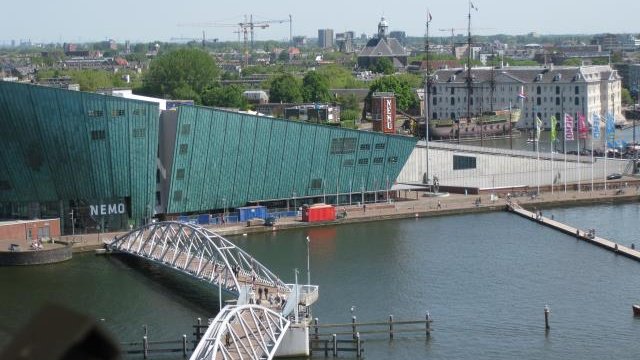 Von der Dachterasse des Restaurants (2. Gebäude von rechts) haben Besucher einen grandiosen Blick über die Stadt und weitere Sehenswürdigkeiten wie das NEMO Science Center bzw. das Schifffahrtsmuseum.