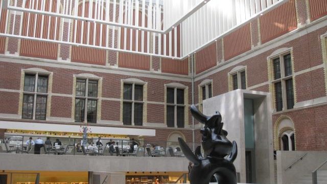 Damit endete der 1. Tag in Amsterdam. Am 05.06.2015 ging es zeitig los, um vor dem großen Touristenstrom in der National Galerie (Innenhof mit Skulptur von Miró im Hintergrund das Museumsrestaurant (oben) und der Museums-Shop (unten)) zu sein und um die größten Schätze wie die Nachtwache von Rembrandt oder Das Milchmädchen von Vermeer aus nächster Nahe zu sehen. Die historische Bibliothek mit ihren gußeisernen Säulen entstand 3 Jahre vor dem Eiffel-Turm.