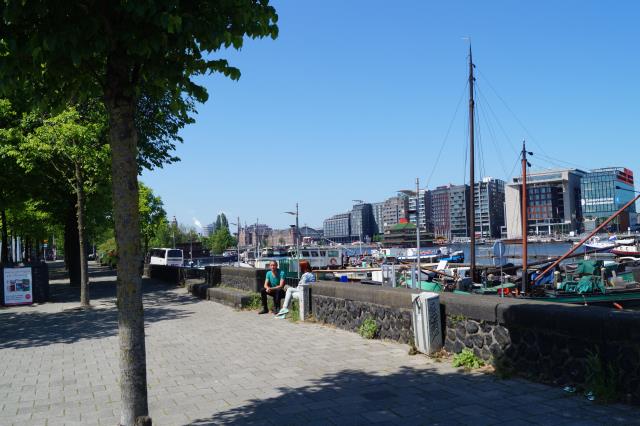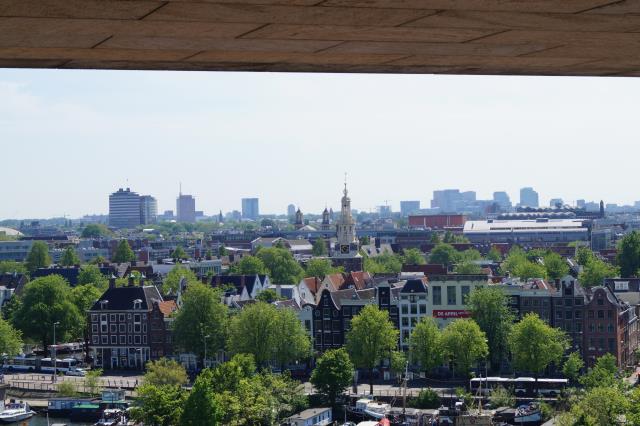 Von der Dachterasse des Restaurants (2. Gebäude von rechts) haben Besucher einen grandiosen Blick über die Stadt und weitere Sehenswürdigkeiten wie das NEMO Science Center bzw. das Schifffahrtsmuseum.