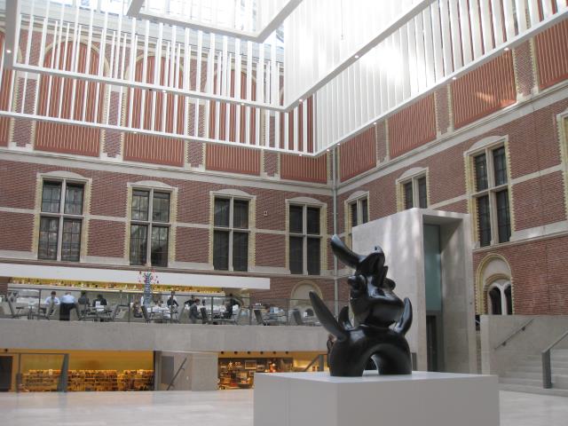 Damit endete der 1. Tag in Amsterdam. Am 05.06.2015 ging es zeitig los, um vor dem großen Touristenstrom in der National Galerie (Innenhof mit Skulptur von Miró im Hintergrund das Museumsrestaurant (oben) und der Museums-Shop (unten)) zu sein und um die größten Schätze wie die Nachtwache von Rembrandt oder Das Milchmädchen von Vermeer aus nächster Nahe zu sehen. Die historische Bibliothek mit ihren gußeisernen Säulen entstand 3 Jahre vor dem Eiffel-Turm.